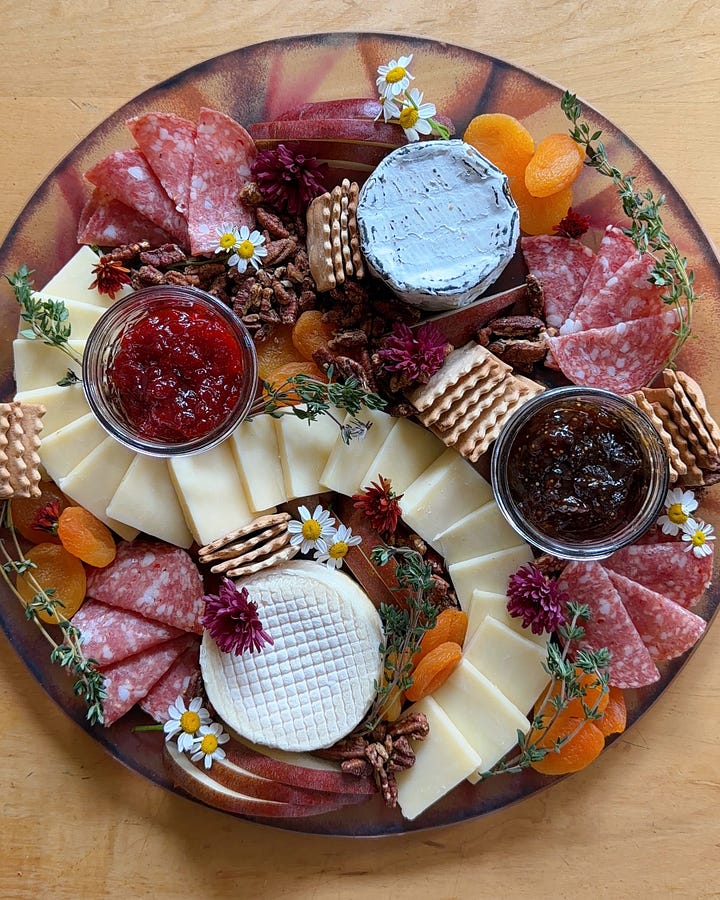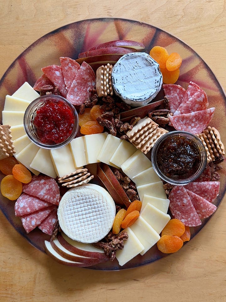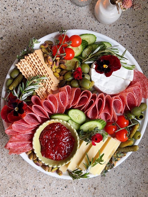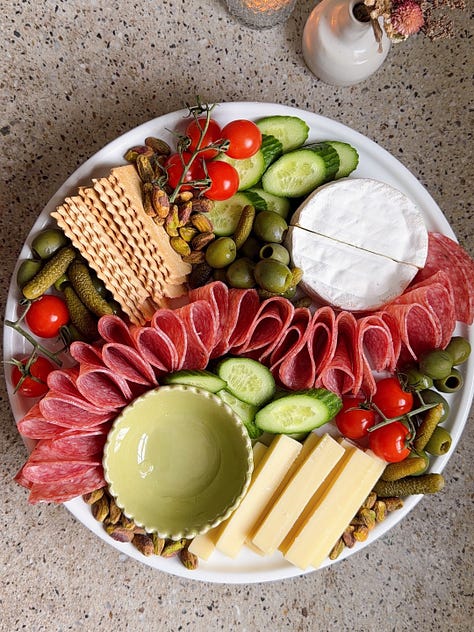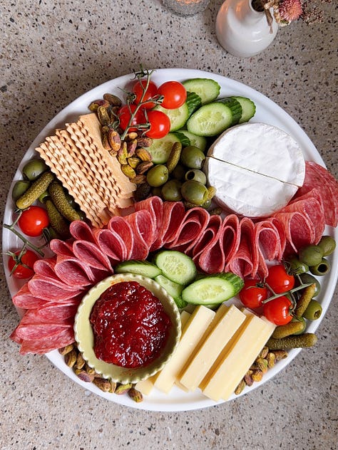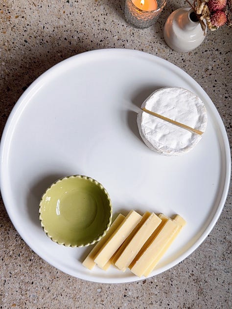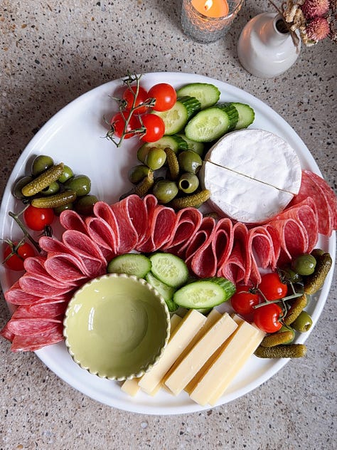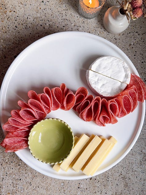 Hi friends, hope you’re staying warm! My week consisted of shoveling my car out of six inches of snow, and spending as much time as I can directly next to my wood burning stove. Upstate winter really gives you a taste of the elements. Now that Thanksgiving is behind us, holiday season is in full force! Between the events, the dinners, the last-minute invites, it helps to have a couple of go-to cheese boards you can rely on. Nothing overly fancy, but snacks that are styled to look like you put a lot more effort in than you actually did. I love easy hosting hacks, so feel free to save this newsletter to reference in the future!