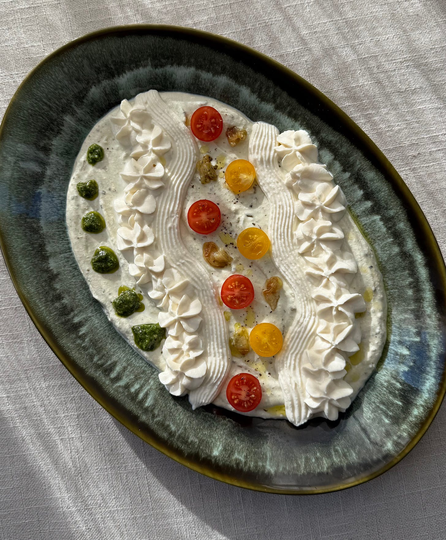 Cake Decorating Tips: I’ve been making savory Decorative Dips with cake tips, and it’s been so much fun. Whipped ricotta has a similar consistency to frosting, allowing you to make so many fun shapes and patterns - See below for my pesto whipped ricotta with roasted garlic and tomatoes!